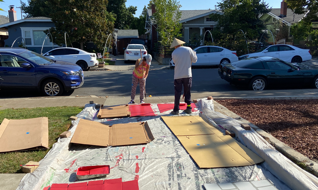 Bich and Brian paint the MANY red panels which will be used to construct the Muppet theater.