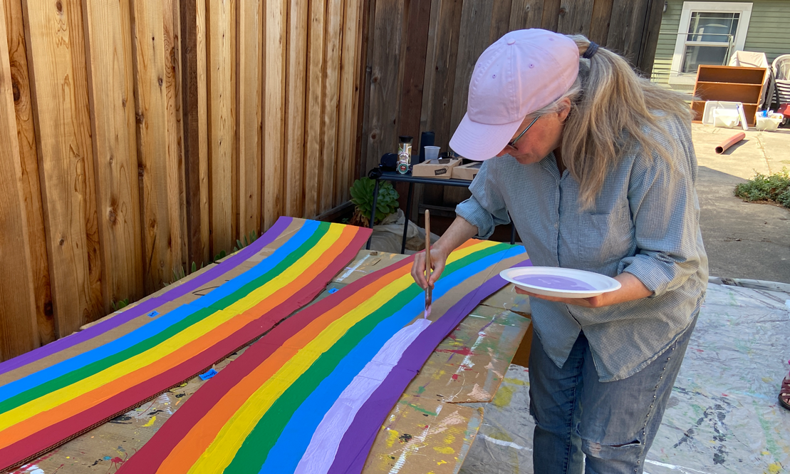 Karen steps in to fill in the final layers of the giant rainbow.
