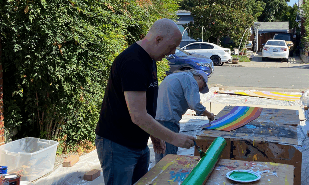 Gary paints the Sesame Street street post.