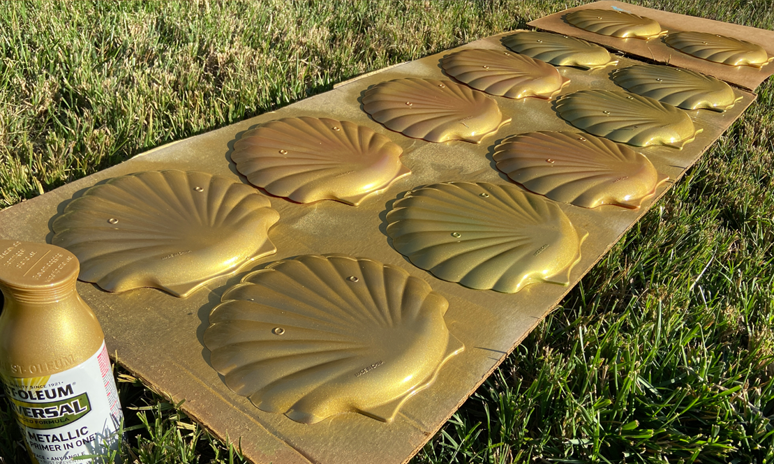 For the foot lights on the Muppet Show stage, we spray painted some shell-shaped plastic plates gold.