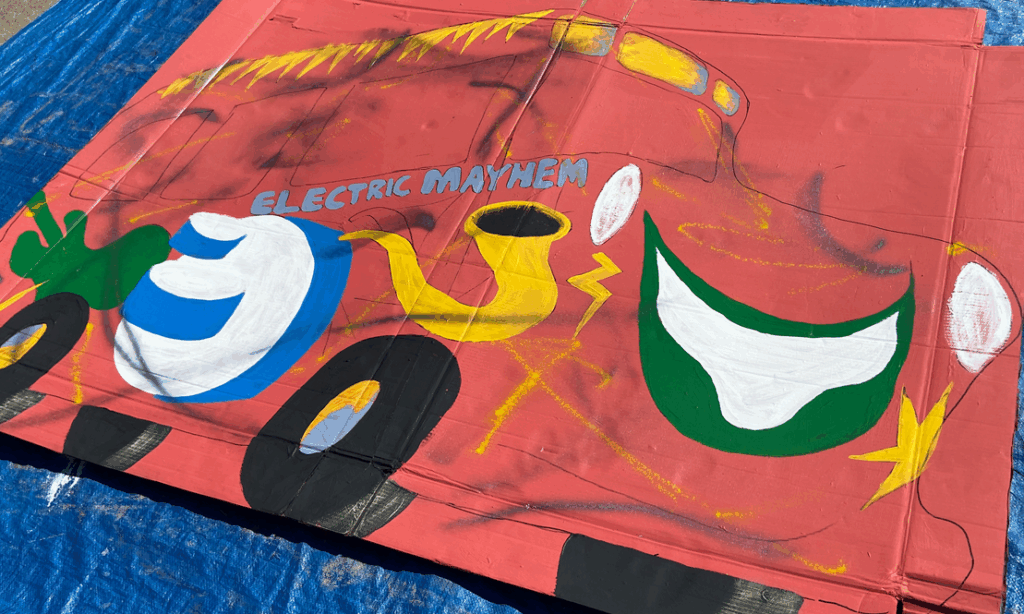 Lots of colors, many layers and a little bit of spray paint—all the essentials for the Electric Mayhem’s bus.
