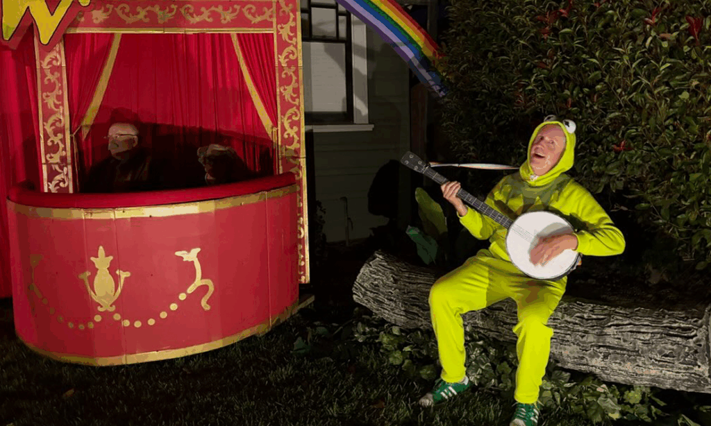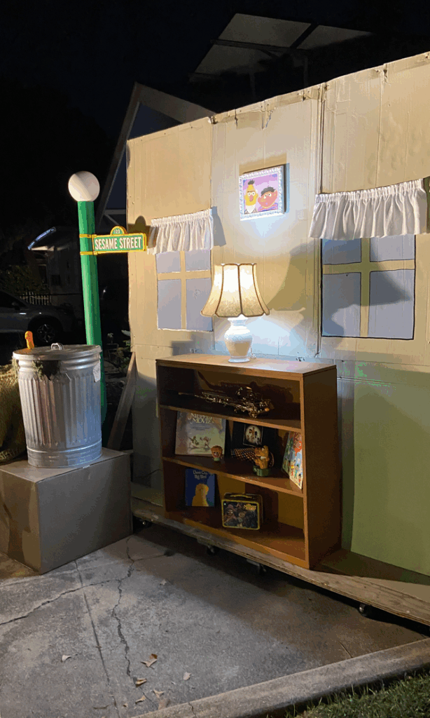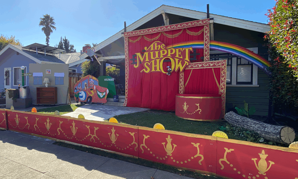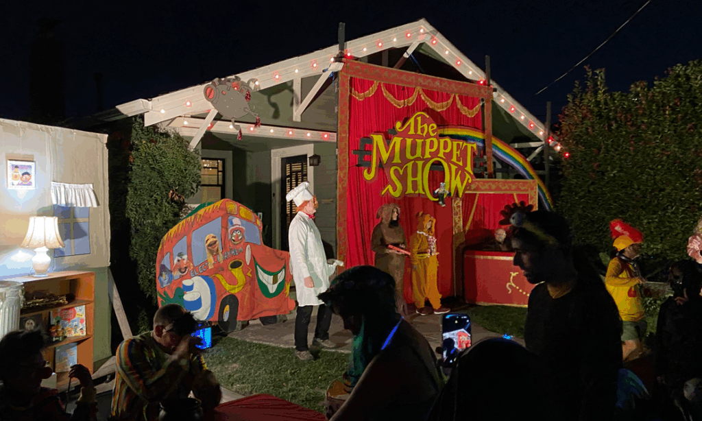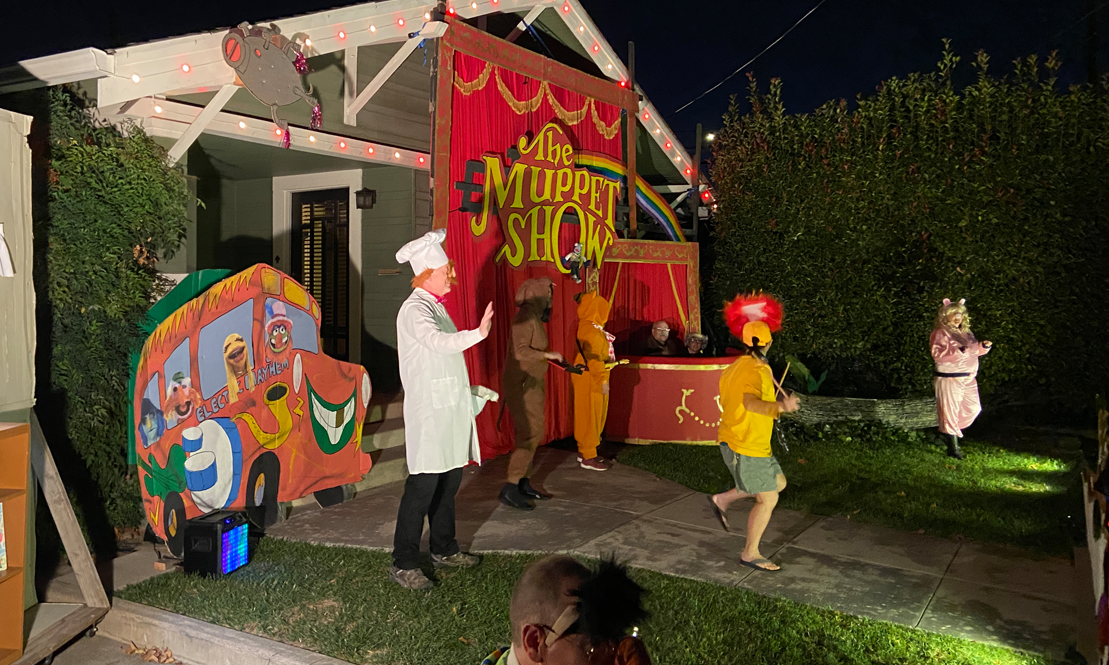 The house is ready for visitors!Kermit and Piggy (and Gonzo) welcome guests!Fozzie starts the evening off with a hilarious joke. Statler and Waldorf are not amused.Visitors gather, greeted by Muppets.Kermit plays the Rainbow Connection on his banjo while sitting on a log in his swamp. He invites everyone to sing along!Miss Piggy greets her adoring fans!The Albertson Halloween House attracts a lot of strange people and creatures!Sesame Street corner features Oscar’s trash can (he’s inside—you can see his hands—but he’s pretty grouchy about all the people), Slimy the worm, the Sesame Street sign post and Ernie and Bert’s apartment, complete with some nick knacks on their bookshelf (Ernie’s going to have to put down the ducky if he wants to play that saxophone).Miss Piggy shows off her Kermit-decorated motorcycle jacket.Muppets sing and the crowd joins in!Some close-up shots of our Muppet friends.Statler and Waldorf say something about this night being ‘like some kind of torture.’The Swedish Chef, Fozzie, Animal and Rowlf say hi.More Muppet friends!The whole Muppet crew!